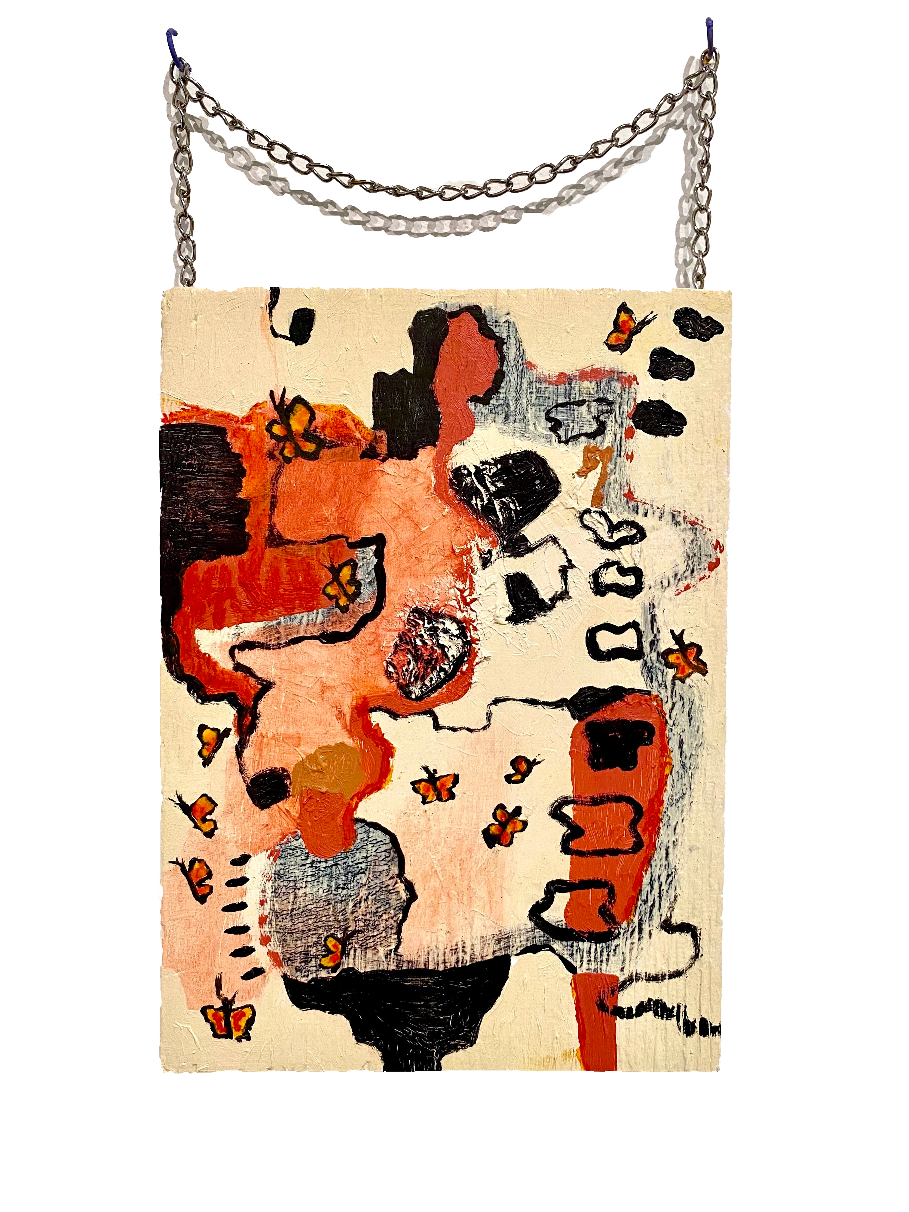 Haley employs a multilayered oil painting process that symbolizes the interplay between what lies on the surface and what is buried deep. Embedded within these layers is backwards writing that acts as a mirror, both between the artist and herself, as well as herself and others. Within this mirror, she invites viewers to introspect on shared identity struggles, implying that “to look at me means you have to look at you too.”